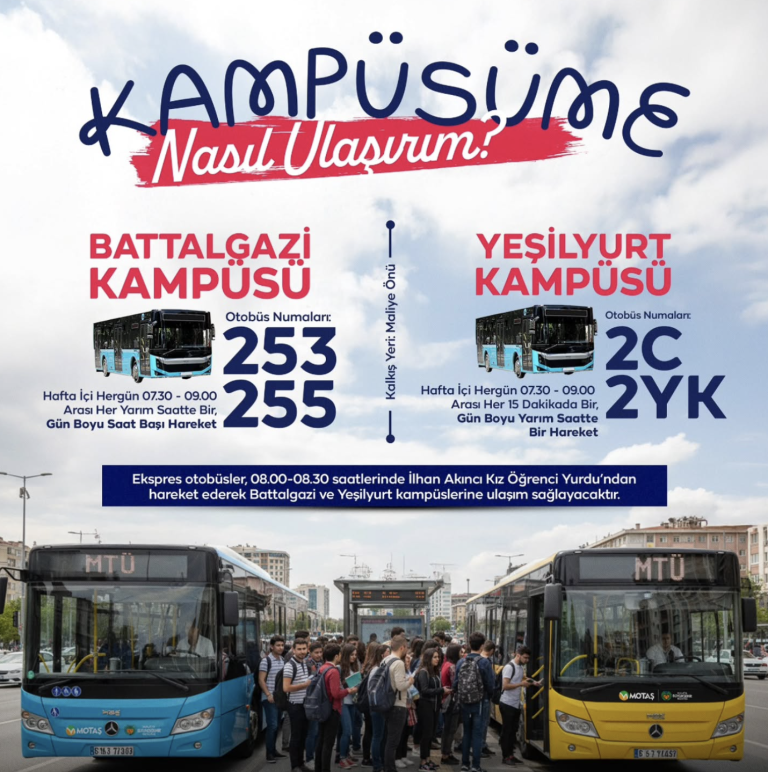 Üniversitemize ulaşım artık çok daha kolay! Battalgazi Kampüsü için: 253 – 255 numaralı otobüsler 📍 Kalkış yeri: Maliye önü Hafta içi her gün düzenli seferler Ayrıca 08.00 – 08.30 saatleri arasında İlhan Akıncı Kız Öğrenci Yurdu’ndan hareket eden ekspres otobüslerimiz ile kampüslerimize ulaşabilirsiniz. 👉 Detaylı saat bilgisi ...