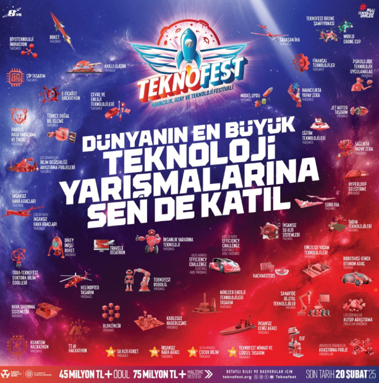 TEKNOFEST 2025, teknolojiye ilgi duyan herkes için kapılarını açıyor! Havacılık, Uzay ve Teknoloji Festivali kapsamında düzenlenen bu eşsiz etkinlikte, 45 milyon TL ödül ve 75 milyon TL malzeme desteği ile birçok farklı alanda yarışmalar seni bekliyor.
